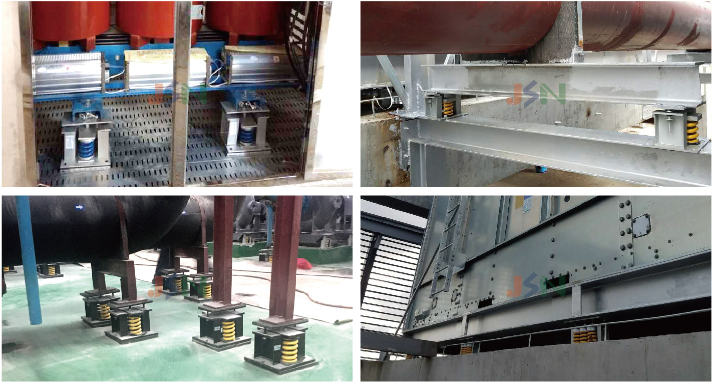 JA型彈簧減振器是由高強度鋁合金外殼、彈簧及橡膠防滑墊組成。該產品為開敞式結構,具有靈活性大、穩定性好、固有頻率低、減振效果顯著等優點,安裝時可直接安放在設備底下,若動力設備擾力較大,可先調節重心,并將減振器底座固定孔用螺栓固定地基。